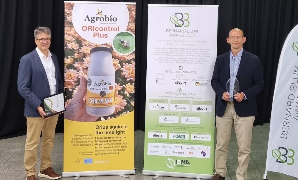 El producto ORIcontrol Plus de Agrobío, desarrollado por el equipo de investigación del catedrático de la UPCT Pablo Bielza, ha recibido el premio internacional Bernard Blum durante el encuentro anual de la industria de biocontrol de plagas, celebrado en Suiza.