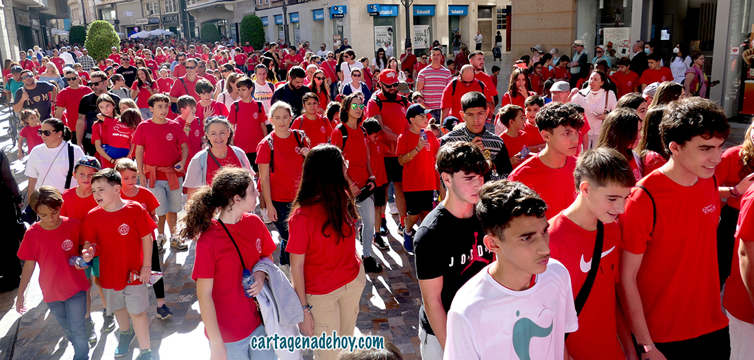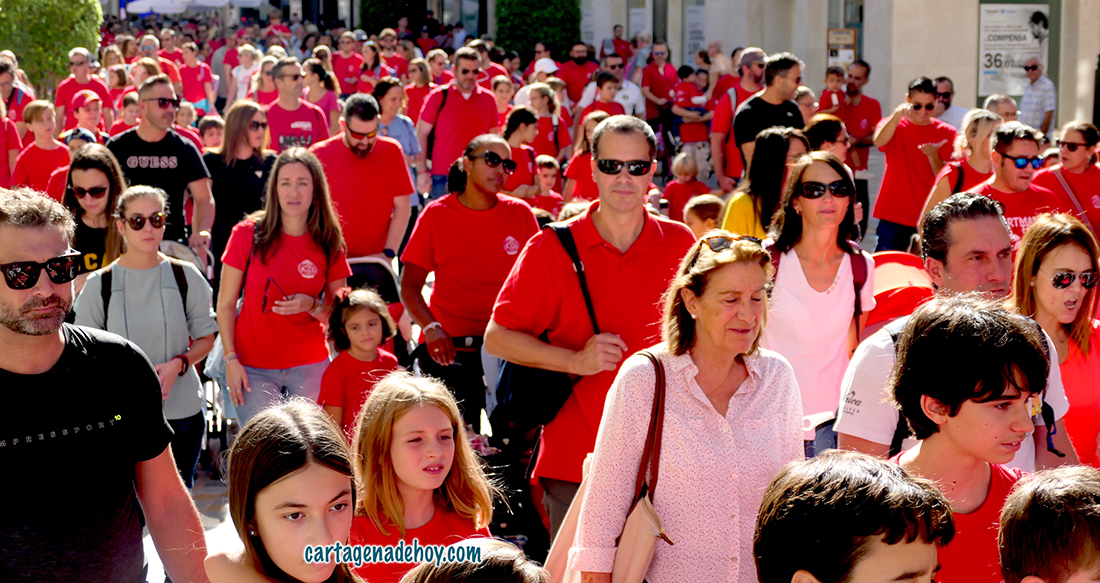 La gran pancarta en cabeza y las camisetas rojas de la casi totalidad de participantes han sido las señas de identidad de un gran grupo que ha comenzado la ruta en el colegio para después tomar por la avenida de Capitanes Ripoll hacia el paseo del Muelle, entrando por Héroes de Cavite en el casco histórico, que han cruzado hasta la calle Santa Florentina, para después ir por Juan XXIII, Ángel Bruna, paseo de Alfonso XIII y regreso al punto de partida.