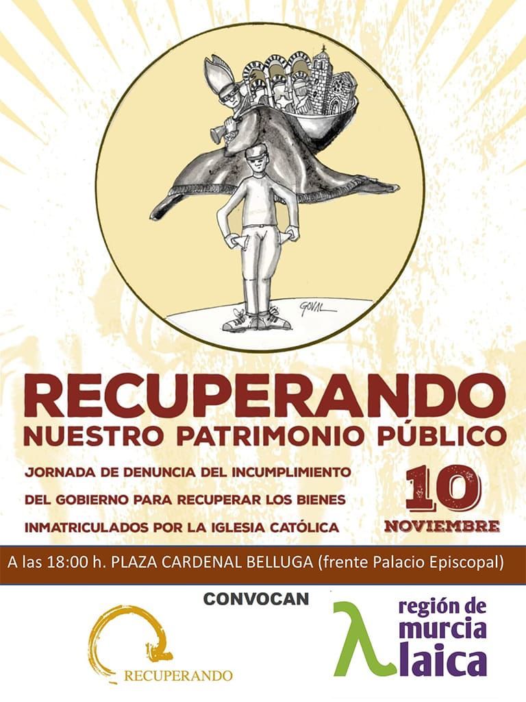 Dos asociaciones convocan una concentración regional frente al Palacio Episcopal, en la plaza Cardenal Belluga de Murcia, para este jueves a las 18 horas, para denunciar “el incumplimineto del gobierno para recuperar los bienes inmatriculados por la iglesia católica”, indican. Cabe recordar que en Cartagena hay 129 familias en la vía judicial contra el Obispado al considerar que les han arrebatado de forma ilícita fosas, nichos y panteones del cementerio de La Palma.