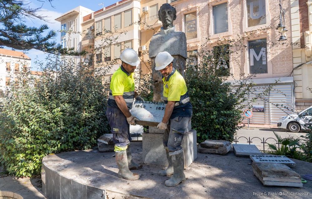 En la mañana de hoy y en el marco de las obras de la remodelación del perímetro de la Plaza de La Merced, se ha procedido al desmontaje del busto del Comandante Villamartín (1833-1872), afamado militar nacido en Cartagena y muy ligado a sus raíces, a pesar de desarrollar buena parte de su vida profesional en distintos destinos de Toledo, Cuba y finalmente Madrid, donde falleció en situación de reemplazo a la edad de 39 años.