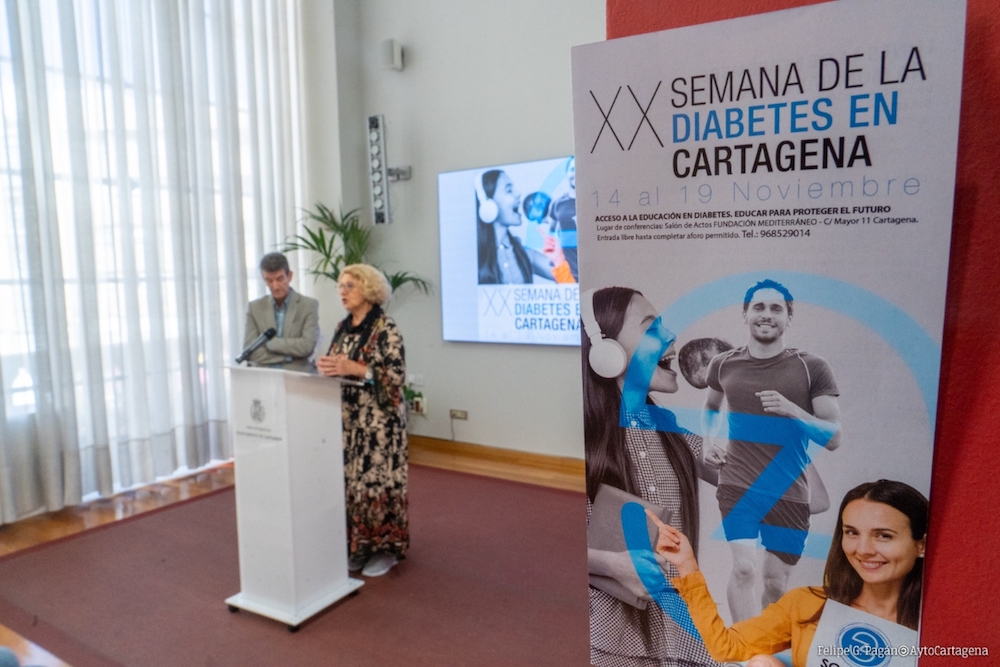 La concejala de Servicios Sociales, Mercedes García, y el presidente de la Sociedad de Diabetes de Cartagena y Comarca (Sodicar), Jose Antonio Baños, han presentado esta mañana en el Palacio Consistorial la programación.