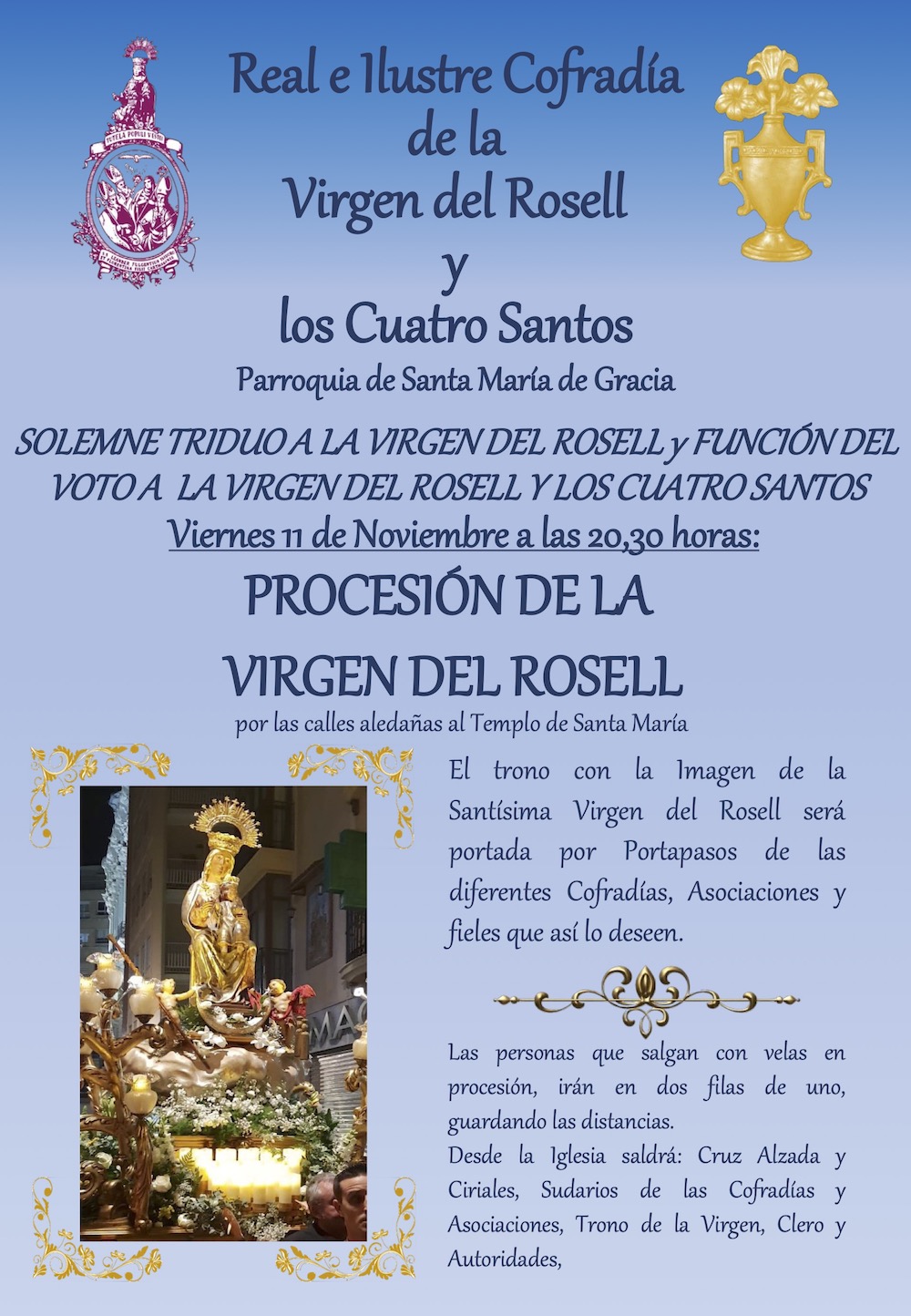 La también patrona de Cartagena recorrerá esta noche, a hombros, las calles del entorno de la iglesia de Santa María dentro del triduo en su honor que se inició anoche y en el que Alberto Castillo, presidente de la Asamblea Regional, fue el encargado de ofrecer la plegaria. Los actos son organizados por la Real e Ilustre Cofradía de la Virgen del Rosell y los Cuatro Santos en la parroquia de Santa María de Gracia.