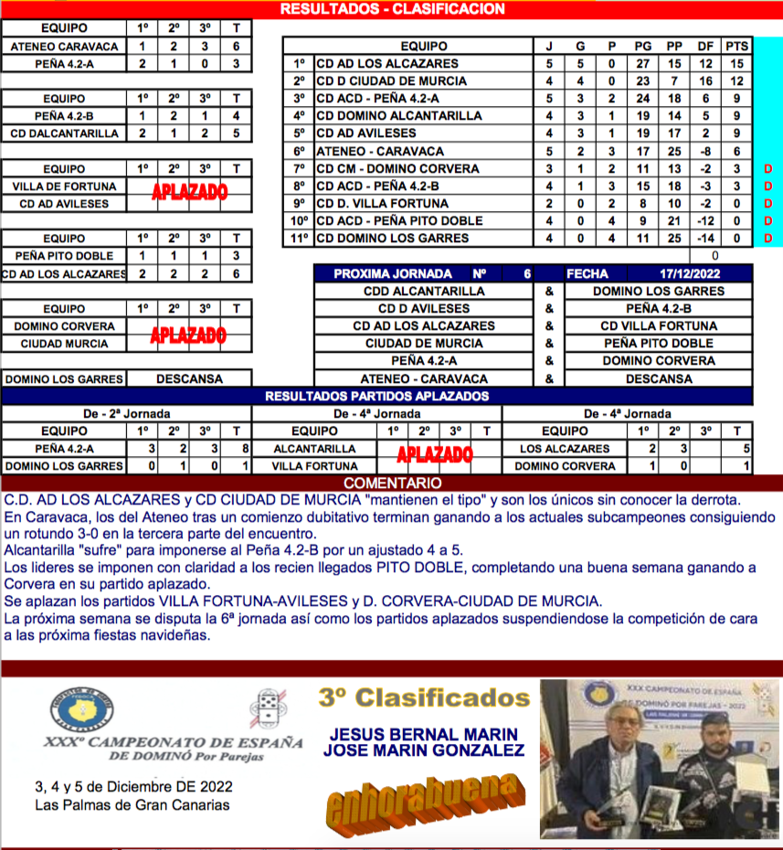 Peña 4.2-A de Cartagena cosecha una victoria y una derrota, marchando en tercer puesto del XXV campeonato regional por equipos, algo alejado de los dos primeros. Por su parte, Peña 4.2 B y Peña Pito Doble de la Barriada de Lapuerta están en el grupo de cola.