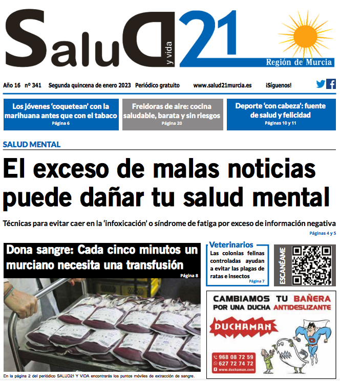 La 'intoxicación' o síndrome de fatiga por exceso de información negativa es el tema principal de portada del nuevo ejemplar de 'Salud 21', que también informa que cada cinco minutos un murciano necesita una transfusión.