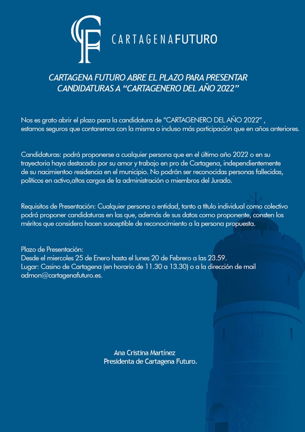 La asociación 'Cartagena futuro' informa que se ha abierto el plazo para presentar aspirantes al galardón, cuya base es que se trate de personas que durante el pasado ejercicio "hayan destacado por su amor y trabajo en pro de Cartagena, independientemente de su nacimiento o residencia en el municipio". No pueden aspirar a este honor políticos, altos cargos, miembros del jurado ni personas fallecidas.