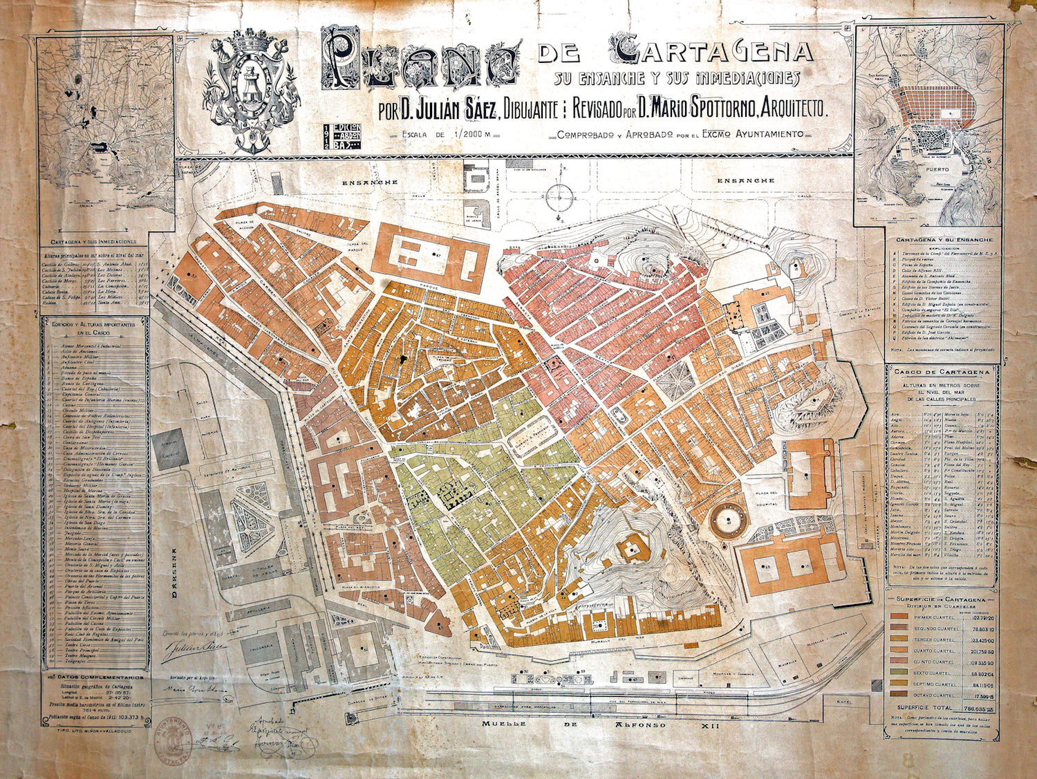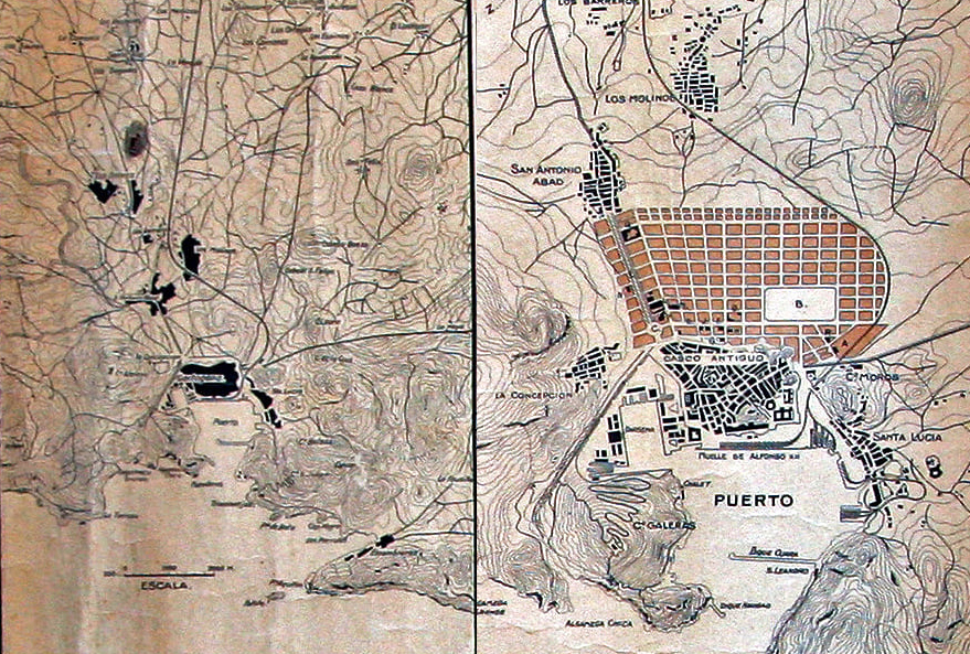 El Archivo Municipal de Cartagena publica un plano de 1912, es decir, cinco años más tarde del estreno del Palacio Consistorial. Además de ver cómo era el casco histórico, hay dos pequeños planos laterales que muestran datos interesantes, como ver cómo el proyecto del Ensanche unión la ciudad con San Antonio Abad, que hasta entonces era pueblo y no barrio, al igual que sucedía con Santa Lucía, Los Molinos, Los Barreros y Los Dolores, entonces cruce de caminos.