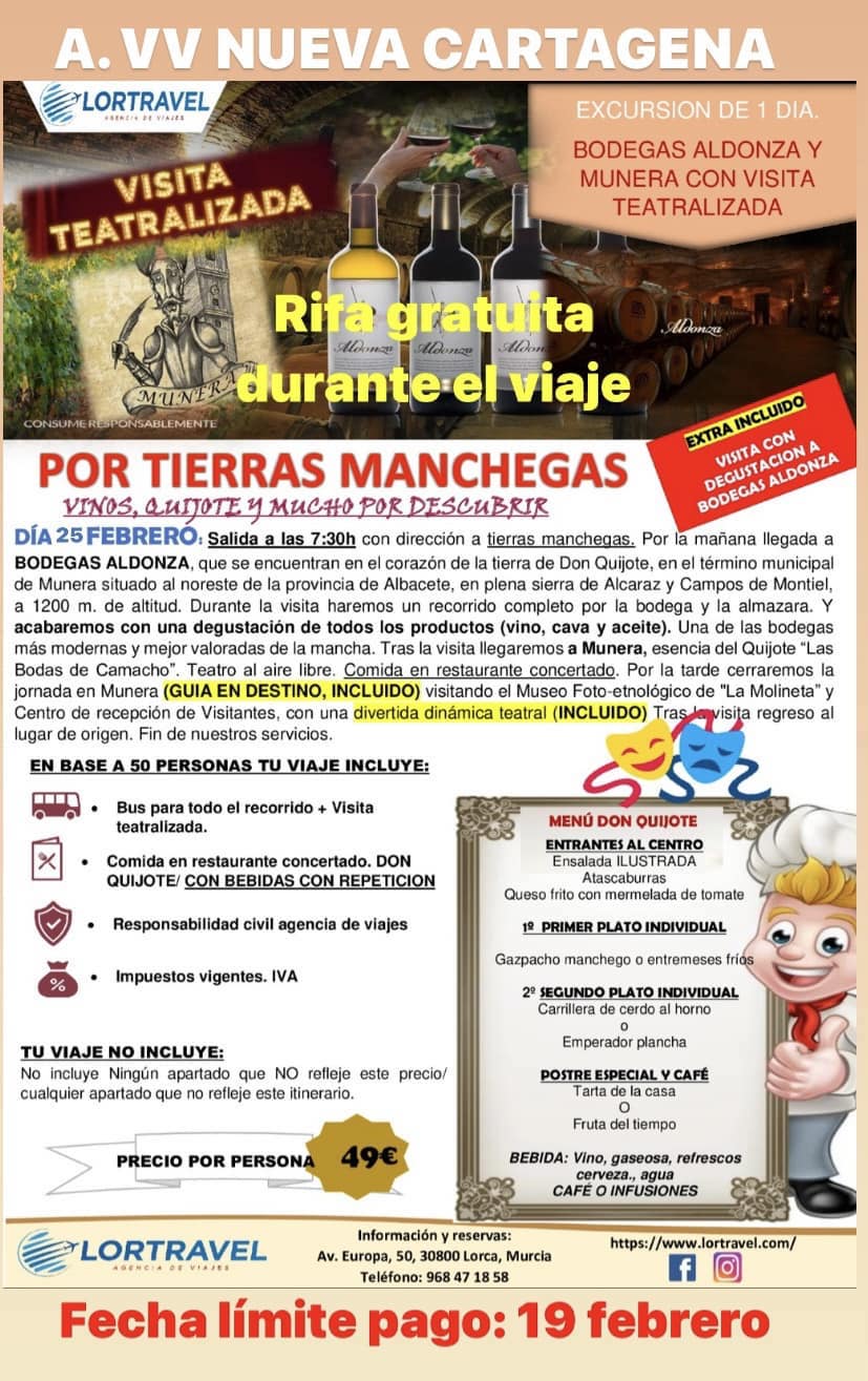 La asociación de vecinos anuncia una visita a tierras manchegas, en concreto, al municipio de Munea, con visita teatralizada a unas bodegas.
