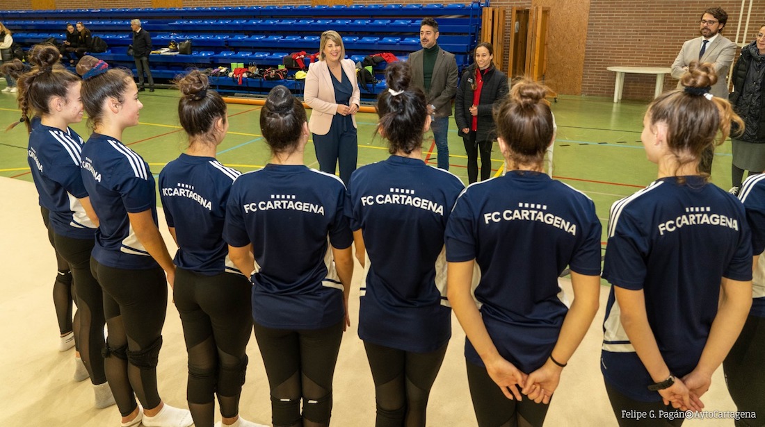 Las gimnastas participantes en la primera fase de la Copa de España de gimnasia estética de grupo, que se disputa este próximo fin de semana en Barbastro (Huesca), han recibido la visita de la alcaldesa, Noelia Arroyo, quien les ha hecho entrega de la enseña de Cartagena y les ha deseado suerte para la primera gran competición de la temporada.