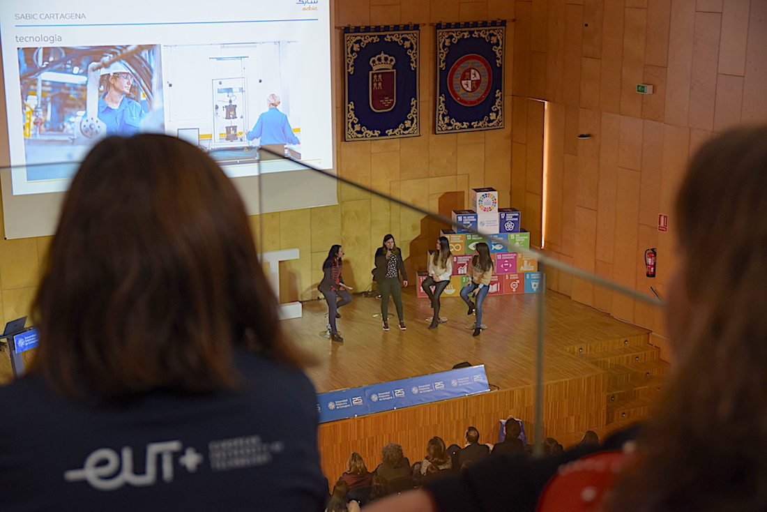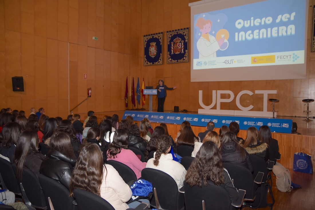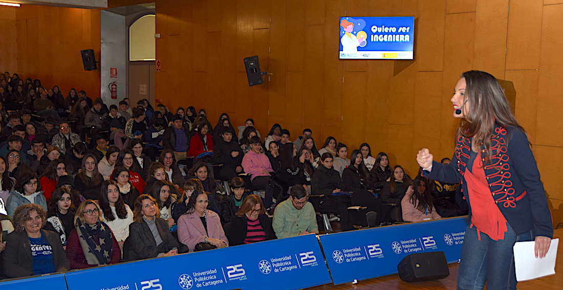 Rompiendo prejuicios y estereotipos, los testimonios de las jóvenes ingenieras que han subido esta mañana al escenario del Paraninfo de la Universidad Politécnica de Cartagena han mostrado a los 550 estudiantes de ESO que lo abarrotaban, en su inmensa mayoría chicas, que las profesiones científico-técnicas no están reservadas a los chicos y que en ellas pueden brillar mujeres como las jefas de grandes proyectos en empresas multinacionales que han explicado su trayectoria profesional y también vital, resaltando la posibilidad de compatibilizar estas carreras y responsabilidades con la maternidad.