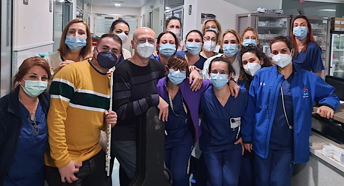 Esta semana ha tenido lugar en la Unidad de Cuidados Intensivos del Hospital Santa Lucía la segunda sesión de terapia musical que se realiza en el servicio y por la que la unidad recibió la visita de dos voluntarios, David y Diego, que fueron interpretando piezas melódicas a la guitarra y flauta travesera, de forma personalizada, en las habitaciones (boxes) de los pacientes que desearon participar.