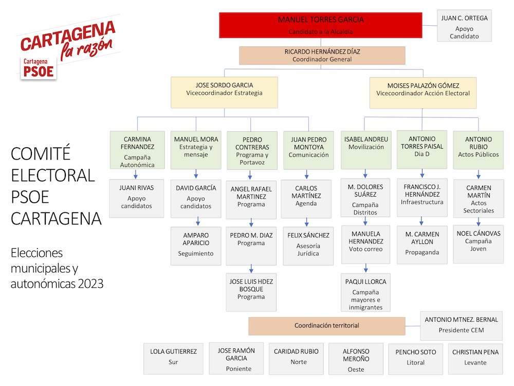 El comité electoral aprobado por la Ejecutiva municipal contará con dos áreas, una de estrategia coordinada por José Sordo y otra de acción electoral que coordinará Moisés Palazón, así mismo constituyen parte del mismo la totalidad de los secretarios generales de las distintas agrupaciones que conforman el término municipal de Cartagena.