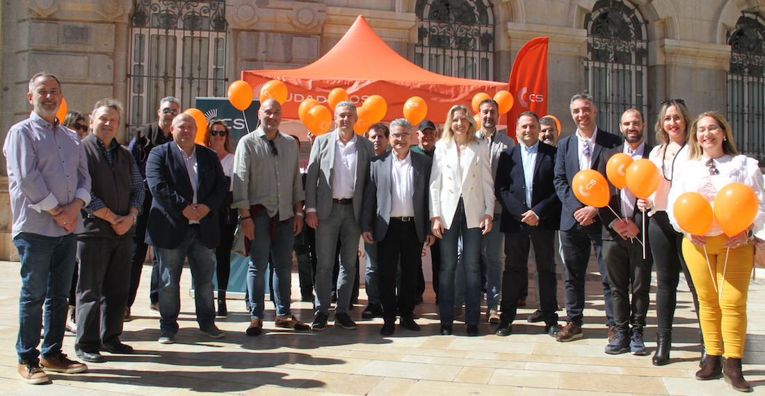 El candidato de Ciudadanos a la alcaldía desgrana algunas de sus propuestas en el acto de presentación de hoy en la plaza del Ayuntamiento, arropado por la cúpula regional y numerosos afiliados y simpatizantes.