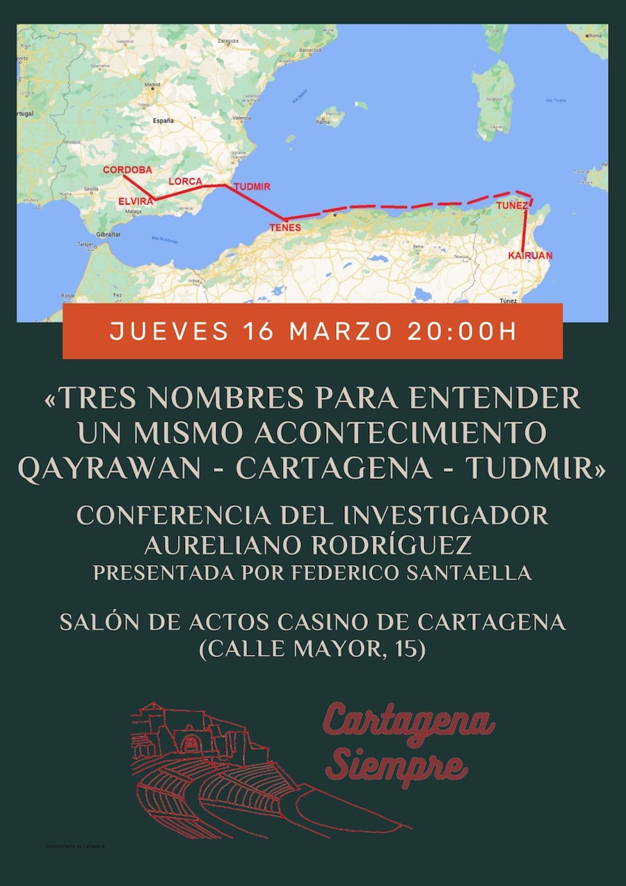 La asociación cultural organiza la charla del investigador Aureliano Rodríguez con el tema 'tres nombres para entender un mismo acontecimiento Qayrawan-Cartagena-Tudmir', que se remonta a la etapa árabe de la ciudad. Será en el salón de actos del Casino de la ciudad el jueves 16 de marzo a las 20 horas.