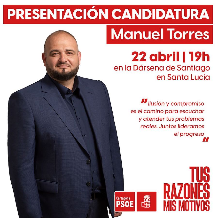 El acto organizado por los socialistas cartageneros, cuya lista encabeza Manuel Torres García, se celebrará el 22 de abril a las 19 horas en la dársena de Santiago de Santa Lucía.