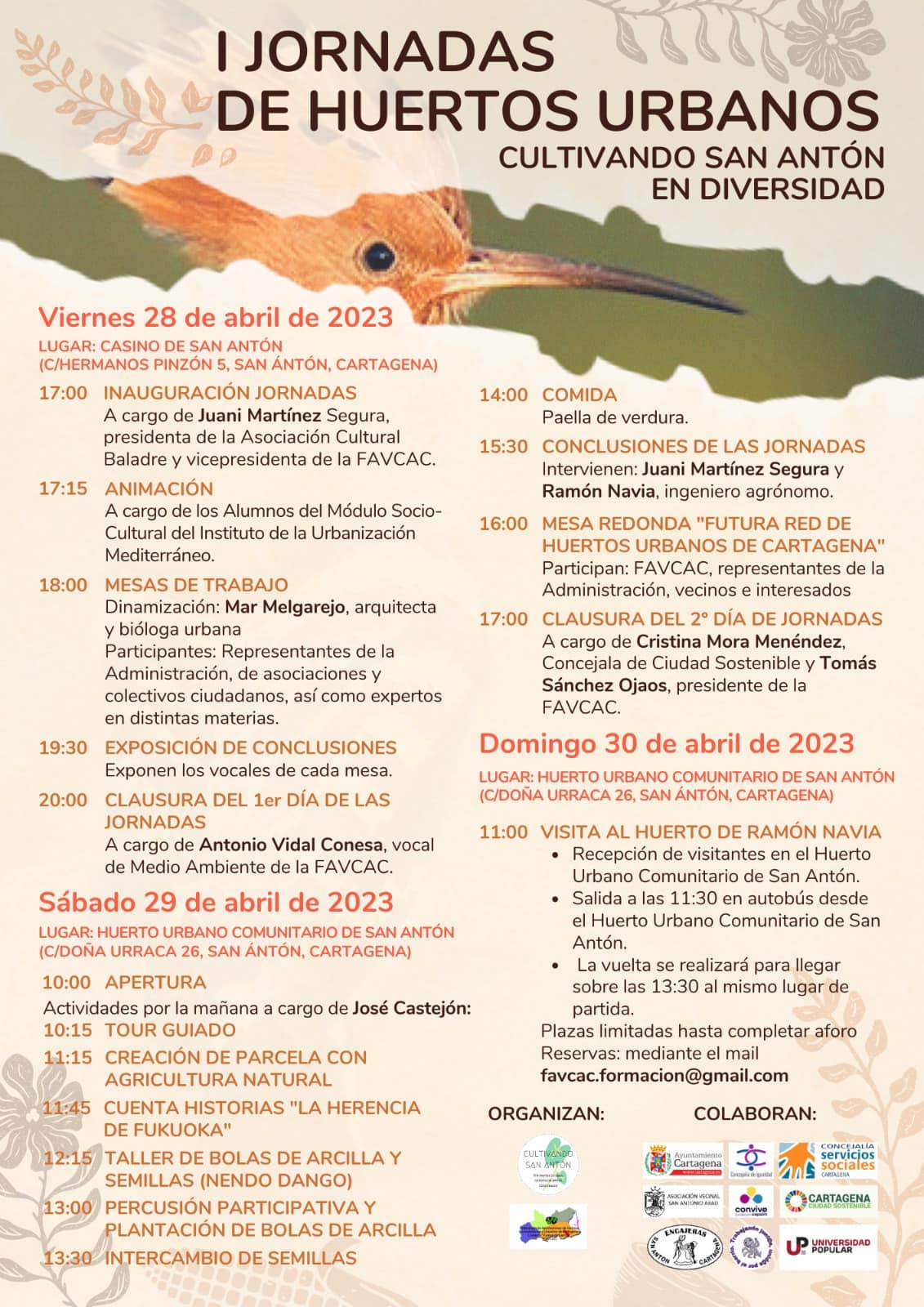 Leer más...Tendrán lugar los días 28, 29 y 30 de abril organizadas por Asociación Cultural Baladre, Cultivando San Antón y la federación de asociaciones de vecinos de Cartagena.
