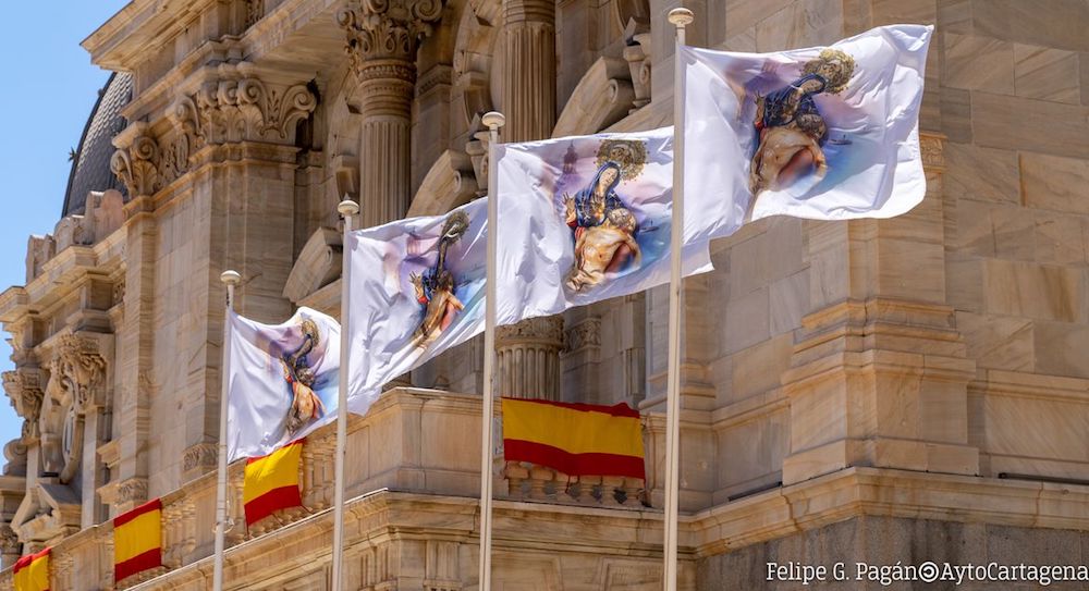 Con motivo dle tricentenario de la llegada de la Virgen de la Caridad, el Ayuntamiento ha engalanado las principales zonas del casco histórico con banderolas de España, al igual que el Palacio Consistorial, en cuyos mástiles de respeto ondean banderas con la imagen de la Patrona, y el domingo lucirá en sus balconadas reposteros de España, de la Región de Murcia y de Cartagena.