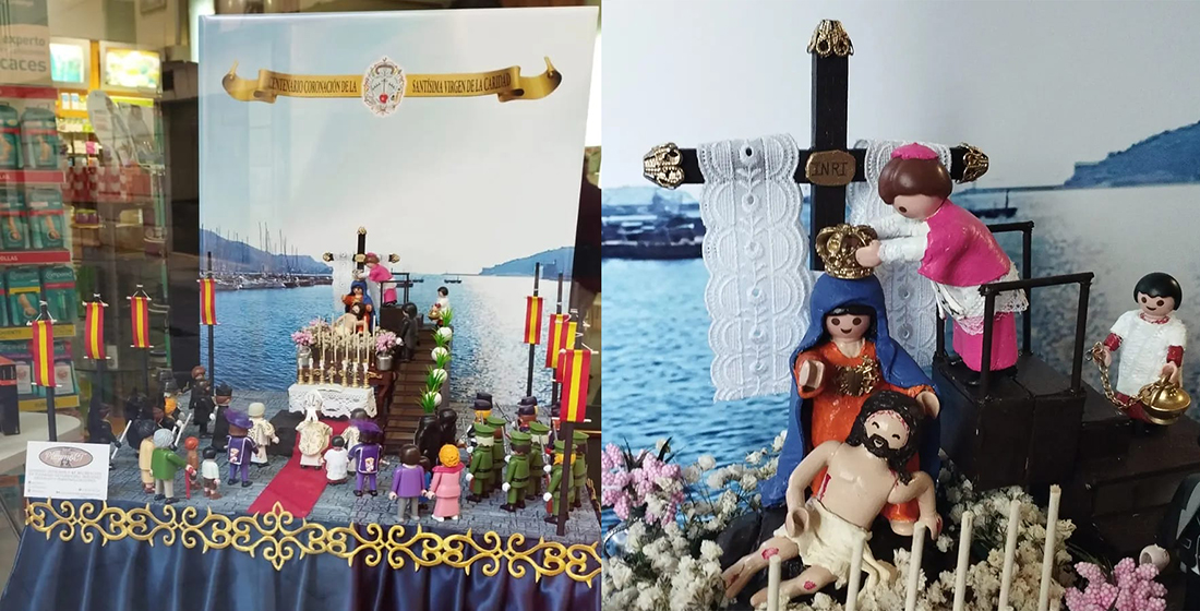 La escena está expuesta en la farmacia de la calle del Aire (Juan Sánchez Carrascosa) del centro histórico de Cartagena con un montaje elaborado por Playmoct, que representa el acto de la colocación canónica de la corona a la Virgen de la Caridad que tuvo lugar en el puerto un 17 de abril de hace cien años.
