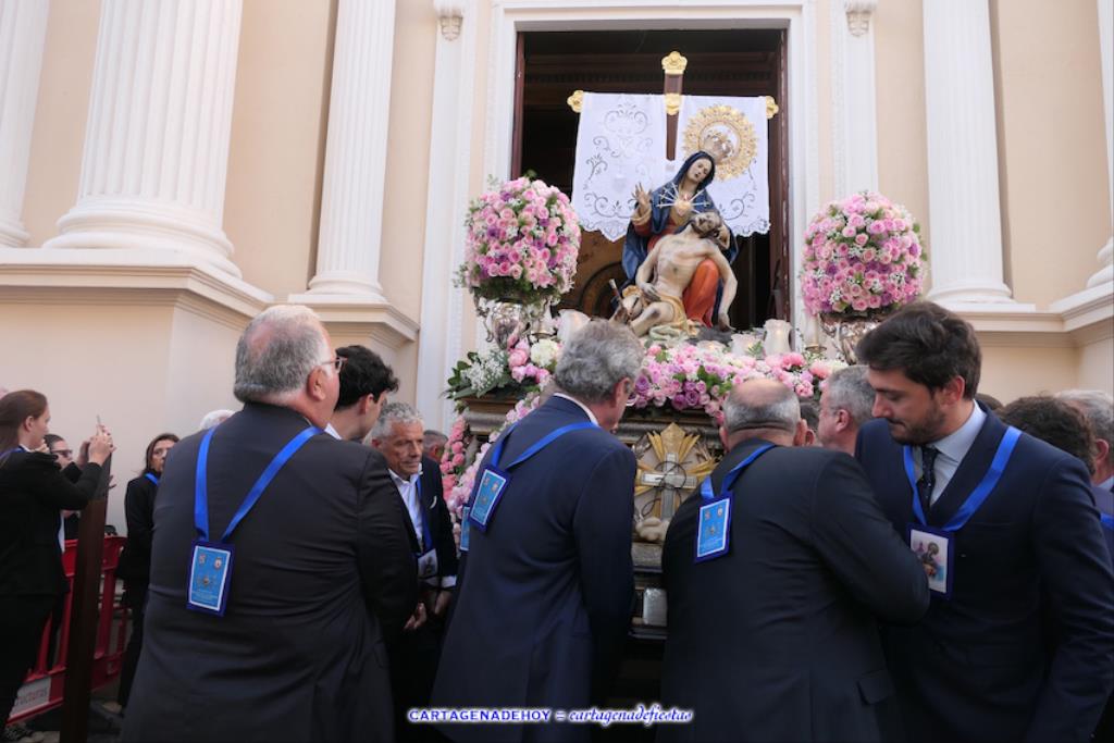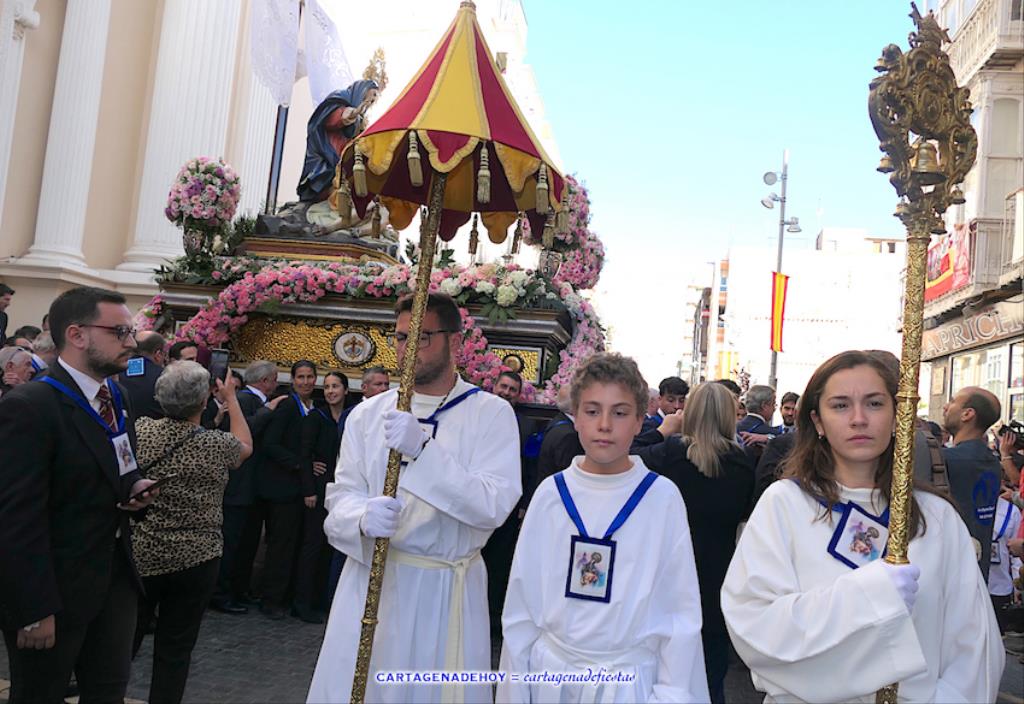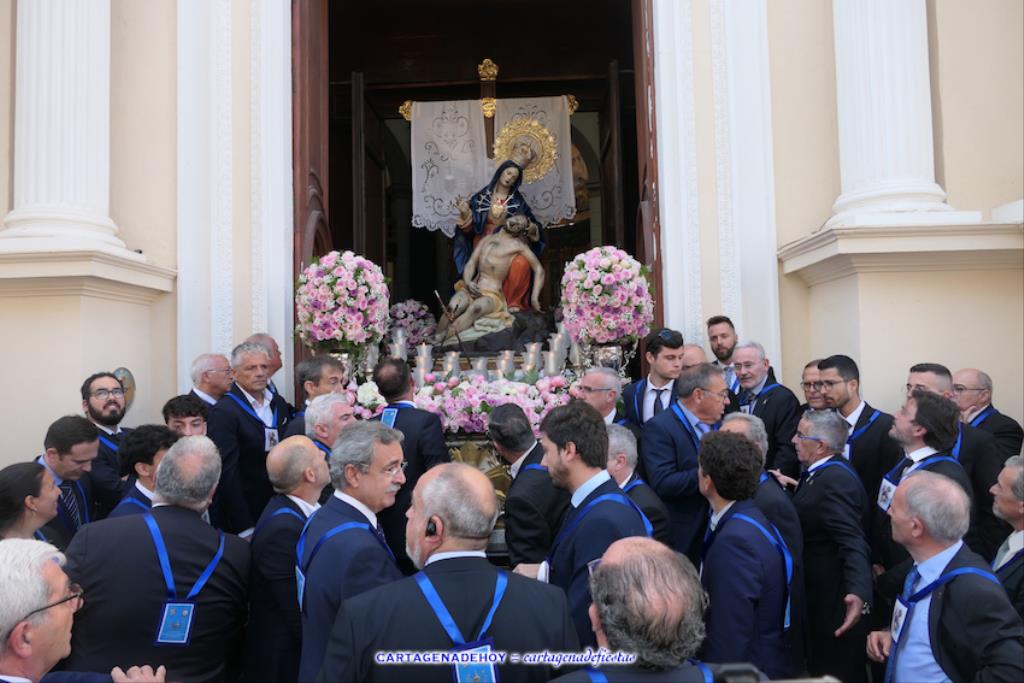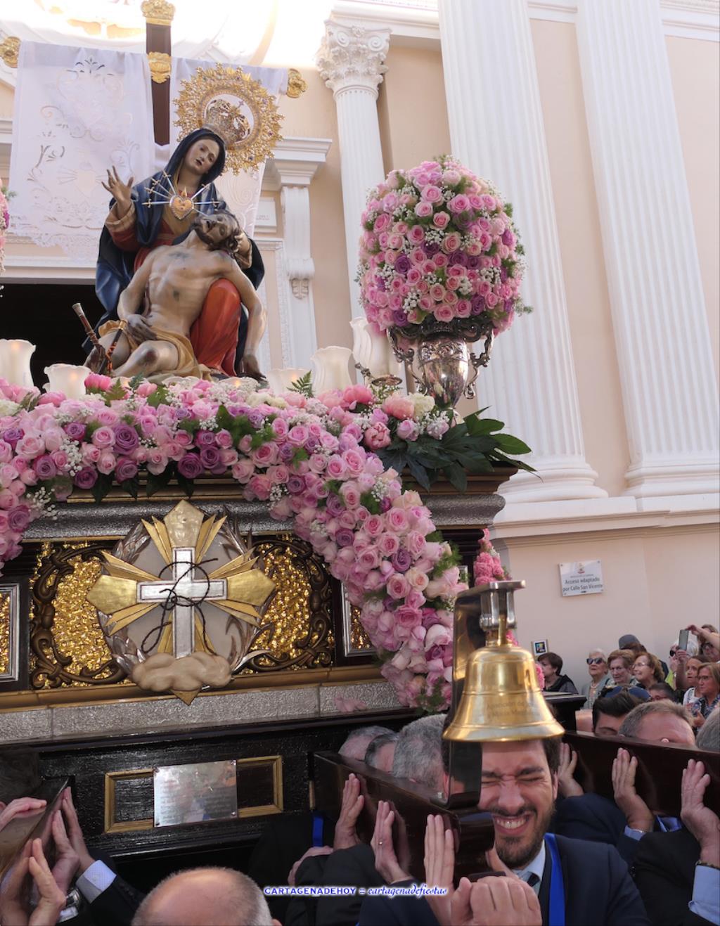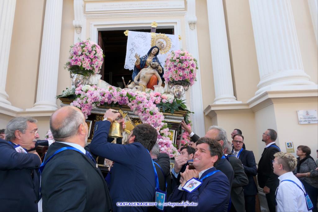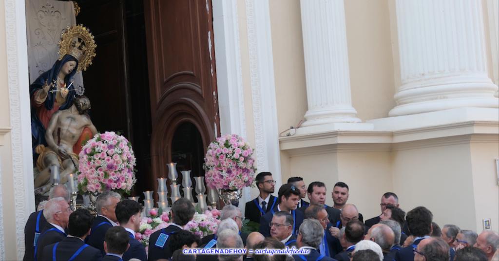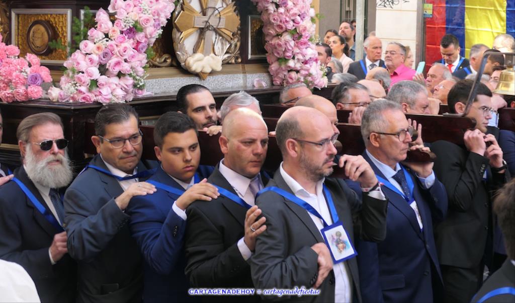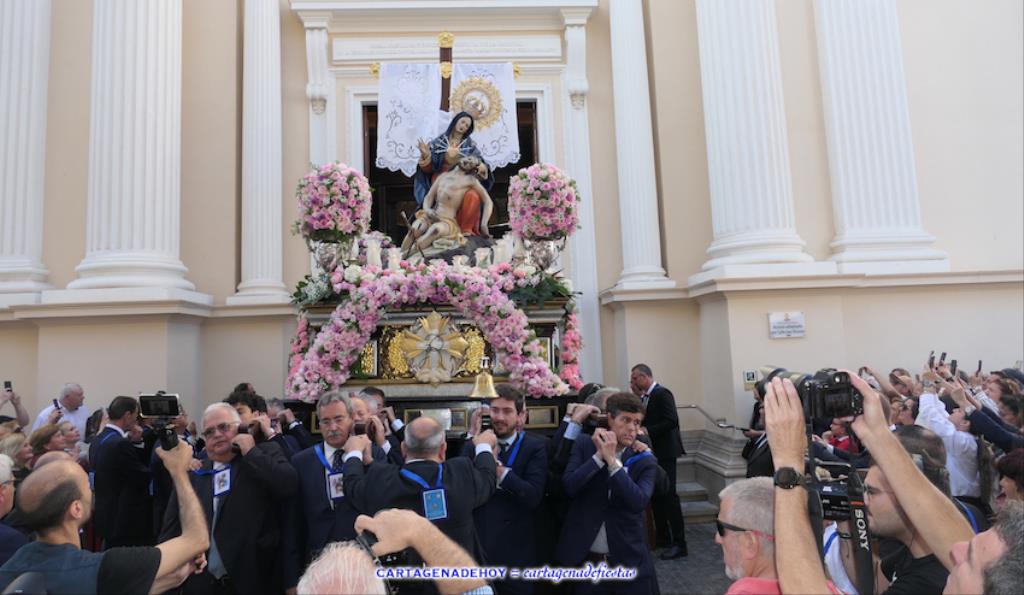 La Virgen de la Caridad, en su 38 salida de su templo en la historia, ha llegado al pórtico de su basílica menor poco antes de las diez menos diez de esta mañana, siendo el equipo de portapasos de la Autoridad Portuaria (recuerda que fueron trabajadores del puerto los primeros que desembalaron la caja en la que venía de Nápoles hace 300 años) con procesionistas de la agrupación de portapasos de La Piedad (marrajos) y del Resucitado.