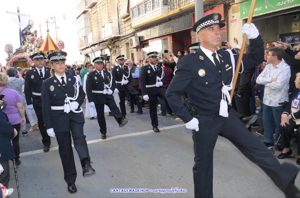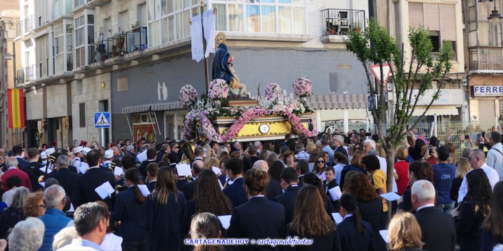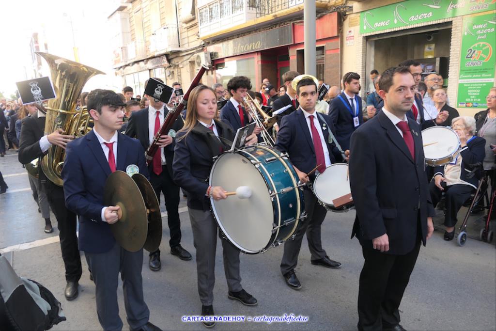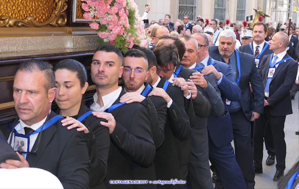 Poco después de salir, han sido hermanos de la Cofradía del Socorro quienes han llevado el primer relevo para portar a la talla, sucediéndose después los restantes grupos (mixtos de varones y féminas) procesionistas y de otras entidades, como Ayuntamiento o UCAM, por ejemplo, calculándose que un millar de personas son las que  meterán el hombro. El trayecto, jalonado por el olor a incienso y los contantes vivas a la Caridad, se ha efectuado con la presencia de numerosos espectadores (y acompañantes), sin llegar a una aglomeración excesiva en algún momento. El capítulo musical de la comitiva lo han protagonizado la banda de tambores 'Quillo' y la agrupación musical 'Sauces'. Luego, durante la ceremonia religiosa, este capítulo ha tenido como protagonista a la Capilla de Música de Cartagena, formada por Pablo Martínez Gil (tenor), Pablo Cano Rojas (barítono), Javier Alburquerque Pérez (violín) e Ibán Huertas San Millán, organista de la basílica, al órgano y la  dirección musical.