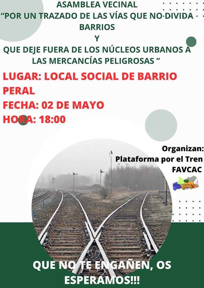 La 'Platafomra por el tren' y la Federación de Asociaciones de Vecinos de Cartagena convocan a la ciudadanía a una reunión que tendrá lugar el 2 de mayo (18 horas) en el local social de Barrio peral con la temática: 'Por un trazado de las vías que no divida barrios y que deje fuera de los núcleos urbanos a las mercancías peligrosas'.