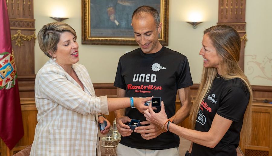 La alcaldesa, Noelia Arroyo, acompañada por el concejal de Deportes, Álvaro Valdés, ha recibido en el Palacio Consistorial, a los recientes ganadores de la XII edición de la 'Ruta de las fortalezas', Juanan Zamora y Mercedes Velasco, ambos cartageneros y pertenecientes al mismo club de atletismo, el Runtritón, cuyo presidente, José Luis Conesa, acompañaba orgulloso a los campeones en esta visita.