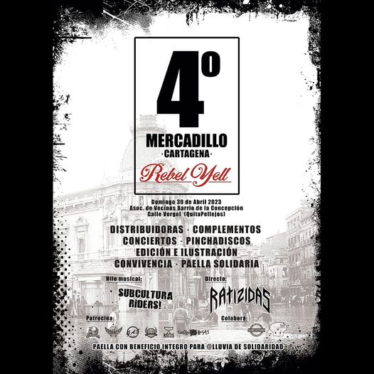 La cuarta edición 'Rebel Yell' se celebra el 30 de abril (11 a 20 horas) en el local de la asociación de vecinos de la calle Vergel con 30 puestos de artesanía, complementos, libros, discos, etc, además de un gran arroz solidario y música toda la jornada con dj y el directo de la banda 'Ratizidas' a las 19 horas.