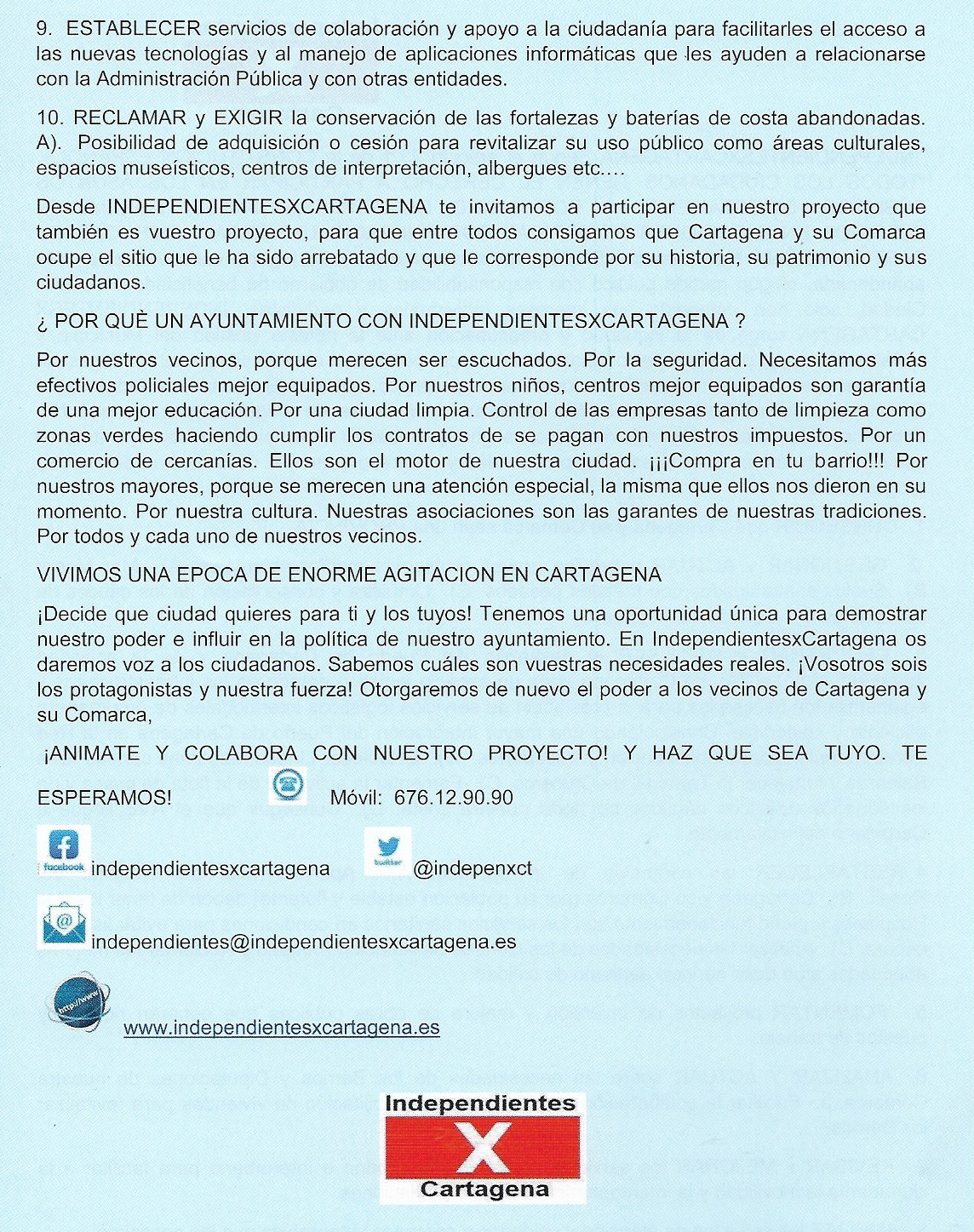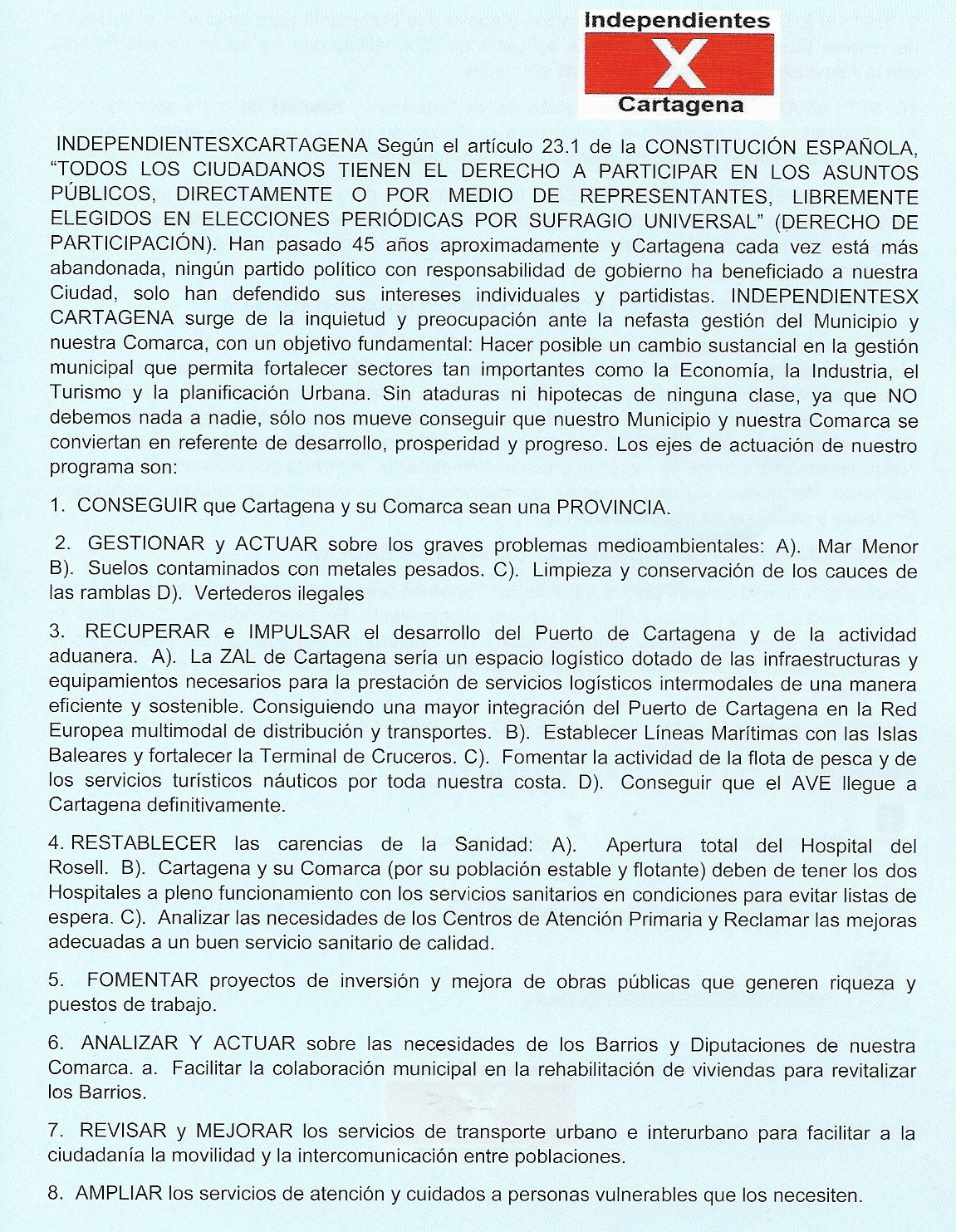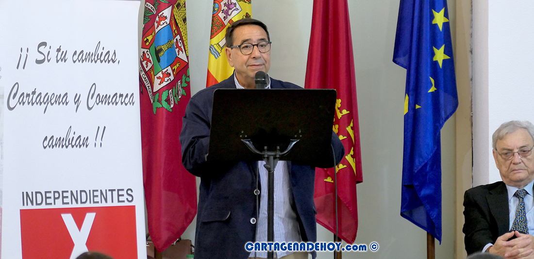 El número 2, Ignacio Navarro, habló que era necesario plantear "una acción alejada de ideologías de Cartagena por el bien de Cartagena y ahora somos 30 valientes los que hemos asumido la responsabilidad de intentarlo", remarcando que son "independientes". Del programa se centró en que hay que potenciar las fiestas "sin ese turismo etílico que las rodea", comentó que en Semana Santa han faltado portapasos y expuso el propósito el objetivo de recuperar patrimonio de barrios y diputaciones, como los molinos de viento. "Parafrasenado a Tomás Martínez Pagán cuando dice que un amigo es la mejor medicina y que un grupo de amigos es una farmacia, IndependientesXCartagena es el botiquín de emergencias que necesita este municipio", afirmó.
