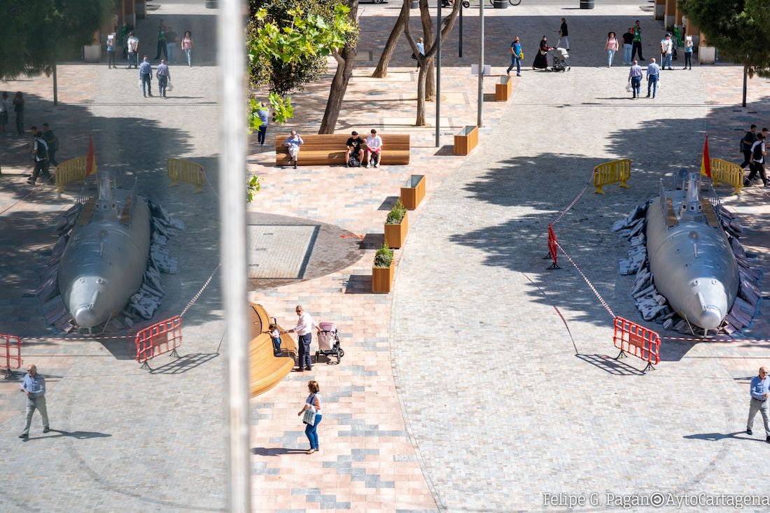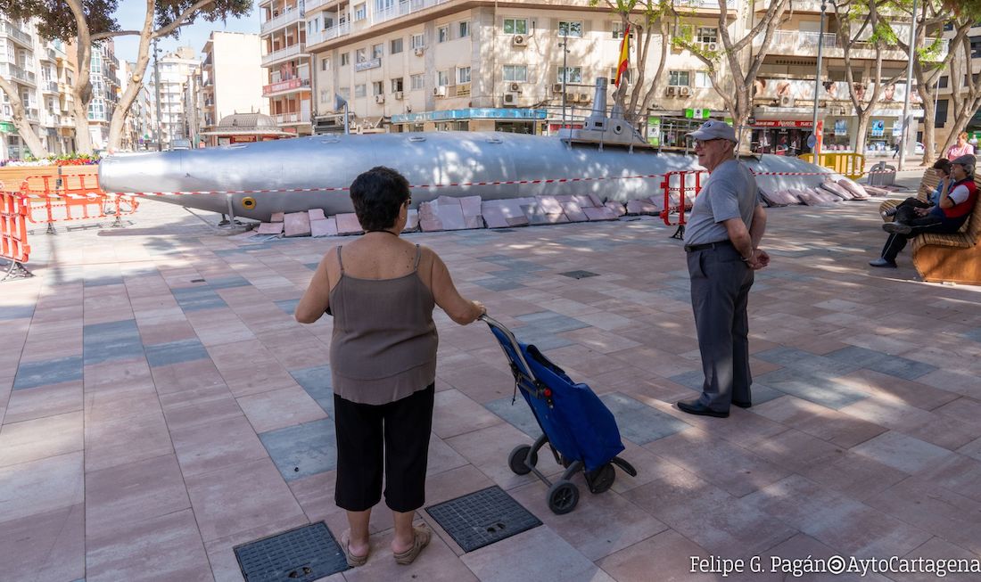 Una réplica a escala real del prototipo del submarino de Isaac Peral Cartagena ha emergido en el centro de Cartagena, concretamente en la plaza Juan XXIII. El 'Isaac Peral', que ya se instaló en el centro de Madrid con motivo del Día Mundial del Submarino, estará expuesto coincidiendo con la celebración de Mucho Más Mayo y La Noche de los Museos. Se podrá visitar hasta el 21 mayo.