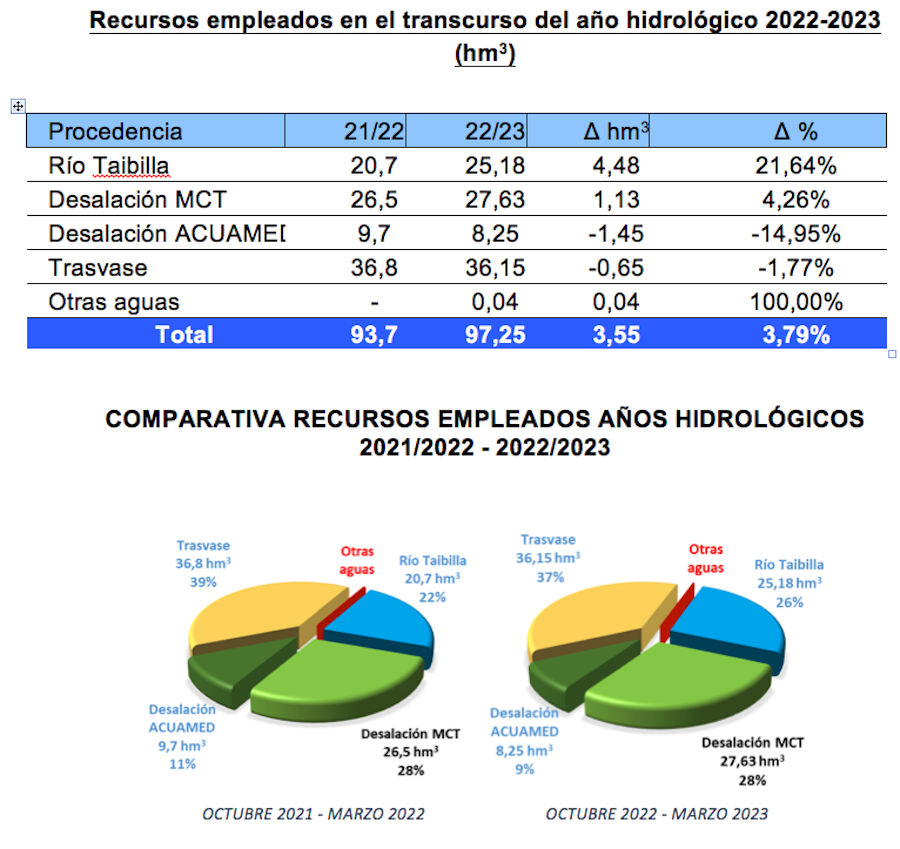 En la reunión del Comité Ejecutivo se ha informado también de la producción de la Mancomunidad de los Canales del Taibilla según los recursos utilizados. El consumo de agua del Trasvase Tajo-Segura se ha reducido en un 1,77 %, mientras que la desalación procedente de las desaladoras propias ha ascendido un 4,2%. El consumo de agua del río Taibilla aumenta en un 21,64 % en comparación con el dato del mismo periodo registrado en el año hidrológico anterior.