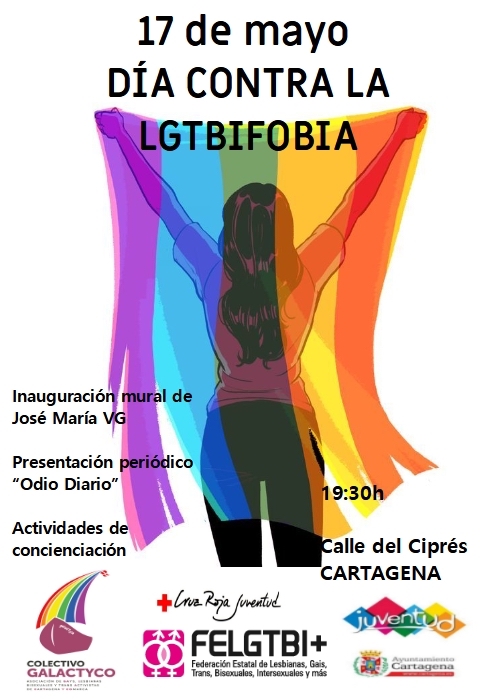 El colectivo Galactyco de Cartagena y Cruz Roja Juventud se unen para celebrar el 17 de mayo el 'Día internacional contra la homofobia, la transfobia y la bifobia', que recuerda la eliminación de la homosexualidad de la lista de enfermedades mentales por parte de la Asamblea General de la Organización Mundial de la Salud en 1990. Por tal motivo, este miércoles se va a inaugurar un mural con la pintura 'El martirio de Sebas' en una fachada de la calle Ciprés, realizado por el artista multidisciplinar José María VG, en el que ha colaborado la Concejalía de Juventud. También se presentará el nuevo periódico elaborado por la FELGTB+.