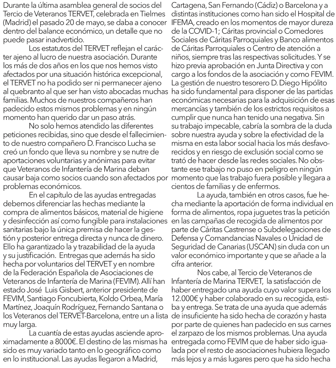 El Tercio de Veteranos de Infantería de Marina ofreció, en la reciente asamblea general de socios celebrada, un balance de su labor durante unos años en los que se ha vivido una complicada situación, pero en los que han conseguido atender las peticiones recibidas y se ha creado un fondo que lleva el nombre de su recordado compañero Francisco Lucha.