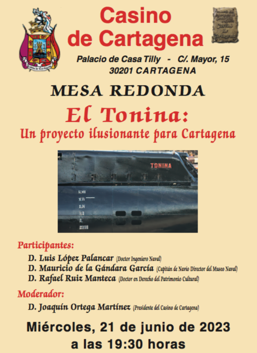 El submarino será musealizado y se exhibirá en seco en la plaza del CIM. Sobre este proyecto gira la mesa redonda organizada por el Casino de Cartagena para este miércoles, a las 19.30 horas, con participación de Luis López Palancar, Mauricio de la Gándara García y Rafael Ruiz Manteca, con Joaquín Ortega Martínez como moderador.