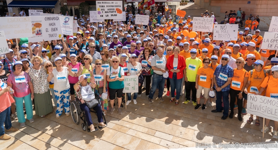 Medio millar de mayores cartageneros han participado hoy en la celebración del 'Día mundial de toma de conciencia del abuso y maltrato en la vejez' y lo han hecho caminando en una marcha multitudinaria organizada por el Ayuntamiento de Cartagena desde la Alameda de San Antón hasta la plaza del Ayuntamiento, donde se leyó un manifiesto en defensa de esta causa.