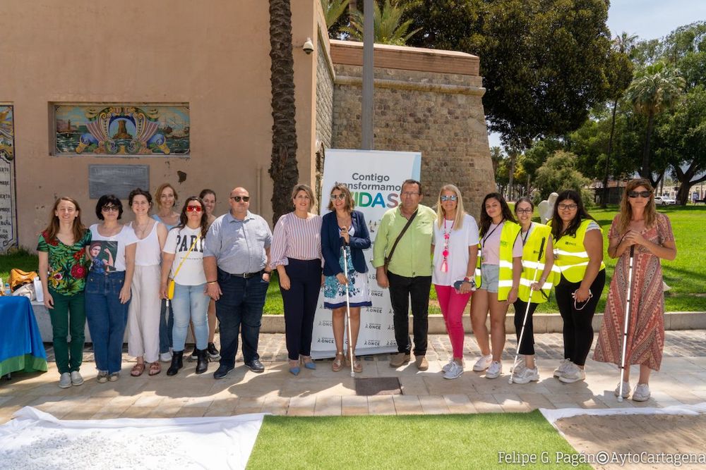 El acto, que se ha desarrollado con motivo de la Semana del Grupo Social ONCE en la Región de Murcia, ha permitido al público cartagenero, a turistas, y todo aquel que ha querido acercarse a la acción, cómo es la sensación de las personas que viven con problemas de visión; haciendo un primer recorrido acompañado por el bastón pisando diferentes superficies, potenciar el olfato y el tacto.