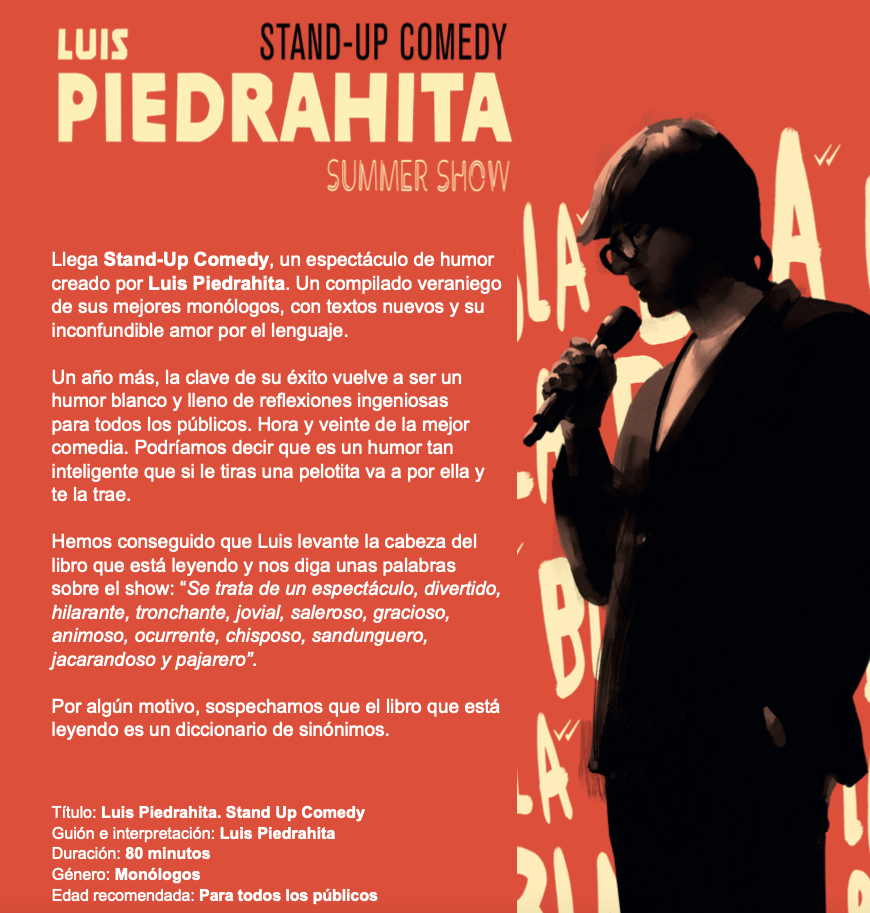 Llega Stand-Up Comedy Summer Show, un espectáculo de humor creado por Luis Piedrahita. Un compilado veraniego de sus mejores monólogos, con textos nuevos y su inconfundible amor por el lenguaje.