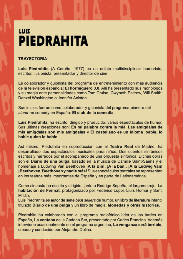 Hemos conseguido que Luis Piedrahita levante la cabeza del libro que está leyendo y nos diga unas palabras sobre el show: “Se trata de un espectáculo, divertido, hilarante, tronchante, jovial, saleroso, gracioso, animoso, ocurrente, chisposo, sandunguero, jacarandoso y pajarero”.