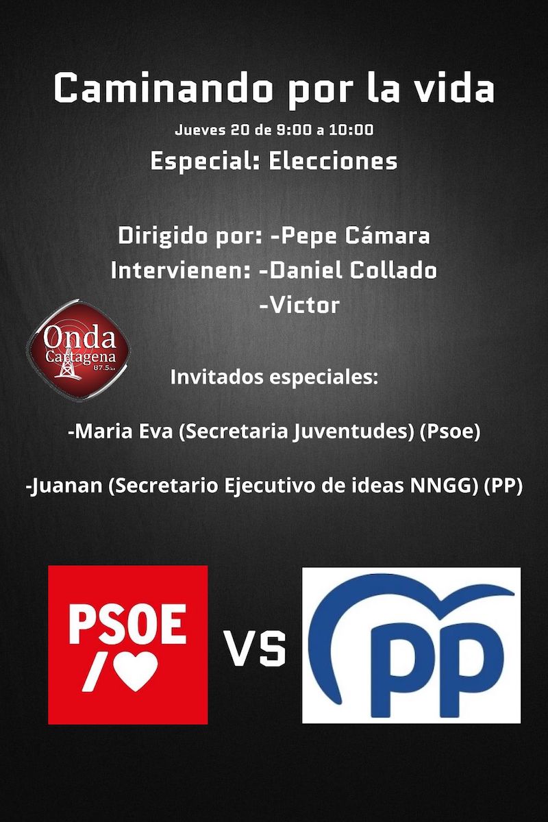 El espacio 'Caminando por la vida' de Onda Cartagena ha acogido esta mañana un especial Elecciones Generales del 23 de julio con María Eva Meroño Escudero (Juventudes Socialistas del PSOE) y con Juan Antonio López Méndez (Nuevas Generaciones del PP), que también ha contado con la participación de Daniel Collado y de Pepe Cámara como presentador y moderador.