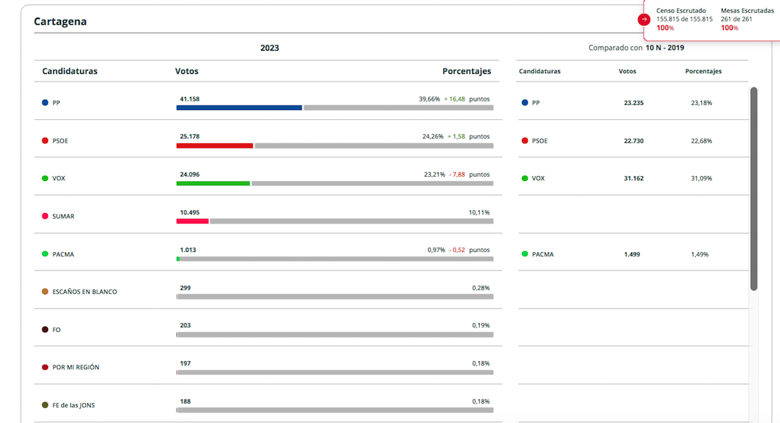 El Partido Popular ha obtenido en estos comicios a las Cortes Generales cerca del doble de los que obtuvo en 2019 al pasar de 23.235 a 41.158. El segundo partido con más apoyo es el PSOE, más alejado pero que también gana votos (2.448) con respecto a cuatro años atrás. VOX, por su parte, pierde pierde más de siete mil, pasando de er el más votado entonces al tercer puesto ahora. Sumar se estrena con 10.495.
