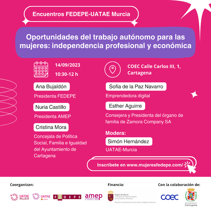 La mesa, moderada por D. Simón Hernández, UATAE - Murcia, estará compuesta por Dña. Ana Bujaldón, Presidenta de FEDEPE, Dña. Nuria Castillo, Presidenta de AMEP, Dña. Cristina Mora, Concejala de Política Social, Familia e Igualdad del Ayuntamiento de Cartagena, Sofía de la Paz Navarro, Emprendedora digital y Esther Aguirre, Consejera y Presidenta del órgano de familia de Zamora Company S.A.