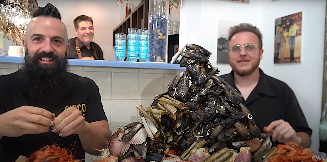 El valenciano ‘Joe Burgerchallenge' y el cartagenero 'ValFerrer', dos de las sensaciones actuales en las redes sociales, han pasado por la marisquería La Marina de Santa Lucía, donde se han pegado un festín infinito de marisco mientras iban montado sobre la mesa la singular 'torre' que se observa con lo que no se ingiere.