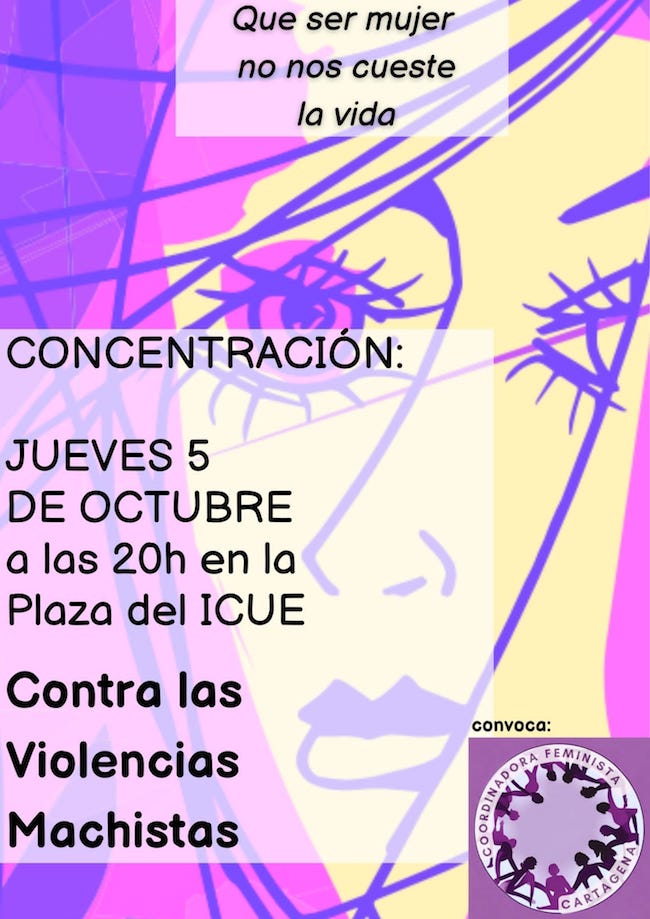 Está convocada por la ‘Coordinadora feminista de Cartagena’ para hoy, a las 20 horas, en la plaza del Icue, motivada por la alta incidencia de denuncias en la Región de Murcia. Los datos del ministerio señalan que este año van 50 mujeres asesinadas a manos de sus parejas o exparejas, pero desde el colectivo estiman que la cifra real es de 87, por lo que llevarán cartulinas con los nombres de todas ellas.