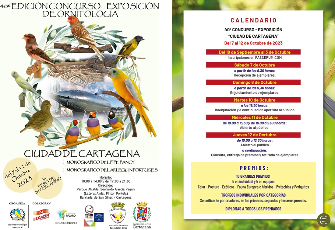 La 40 edición del concurso-exposición de ornitología que organiza la Sociedad Ornitológica Isaac Peral se celebra del 7 al 12 de este mes en el parque Alcalde Bernardo García Pagán de la barriada cartagenera, habiendo registrado 570 inscritos, lo que supone un récord historico del evento. Incluirá los primeros monográficos de ‘Fife Fancy’ y del ‘arlequín portugués’, cuyos ganadores recibirán el trofeo que se observa en la imagen con la silueta del Submarino Peral.