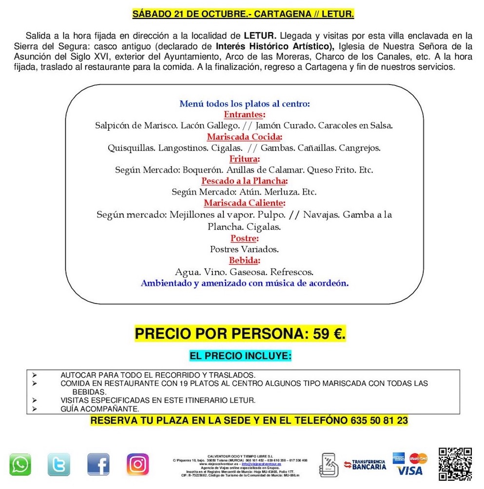 El desplazamiento a la histórica población albaceteña de la Sierra del Segura se ha fijado para el sábado 21 de octubre con un precio de 40 euros (son 59 pero la asociación pone 19 por pasajero) que incluye traslados, comida (con mariscada) y visitas con guía. Se pueden apuntar también aquellos que no sean socios de la asociación de vecinos.