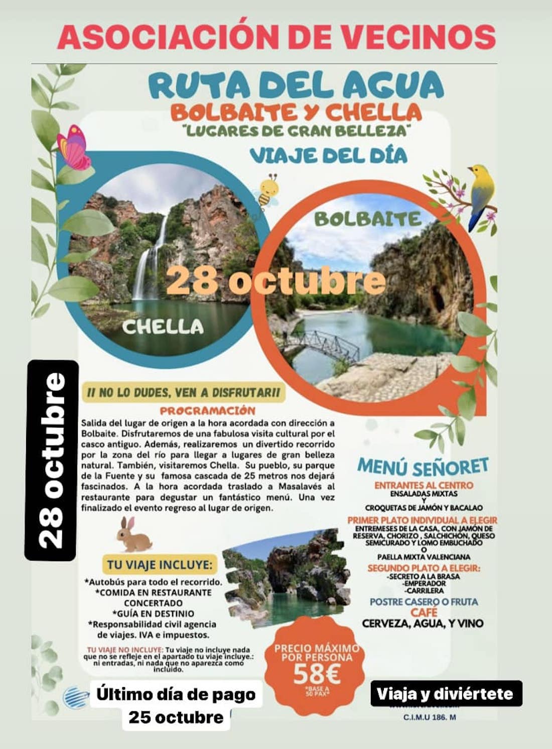 La asociación de vecinos organiza una ‘Ruta del agua’ para el 28 de octubre por Chella y Bolbaite, poblaciones de la provincia de Valencia. El precio es de 58 euros, que incluye desplazamiento, comida y guía para las visitas.