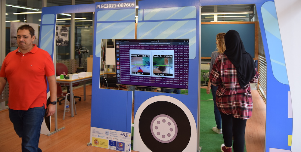 Los ensayos se realizarán en la maqueta de un autobús con los sensores con IA instalado en uno de los stand de la UPCT en El Malecón, donde se celebra la SeCyT. Al pasar bajo el sensor, el dispositivo detectará a la persona y la seguirá su salida.
