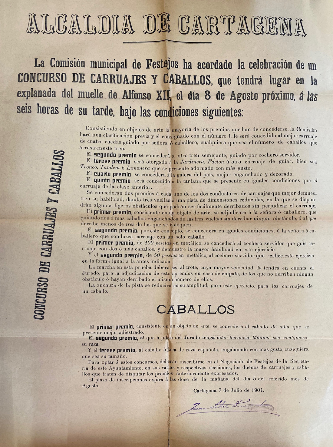 Un documento ya refleja que se celebra en el año 1904, con lo que acumula casi ciento veinte años. Este domingo regresa, con el 'VI Concurso nacional de enganches de tradición', la cita con unos 25 vehículos tirados a caballo procedentes de diferentes puntos de España y que efectuarán un recorrido entre el Cartagonova y la Cuesta del Batel.