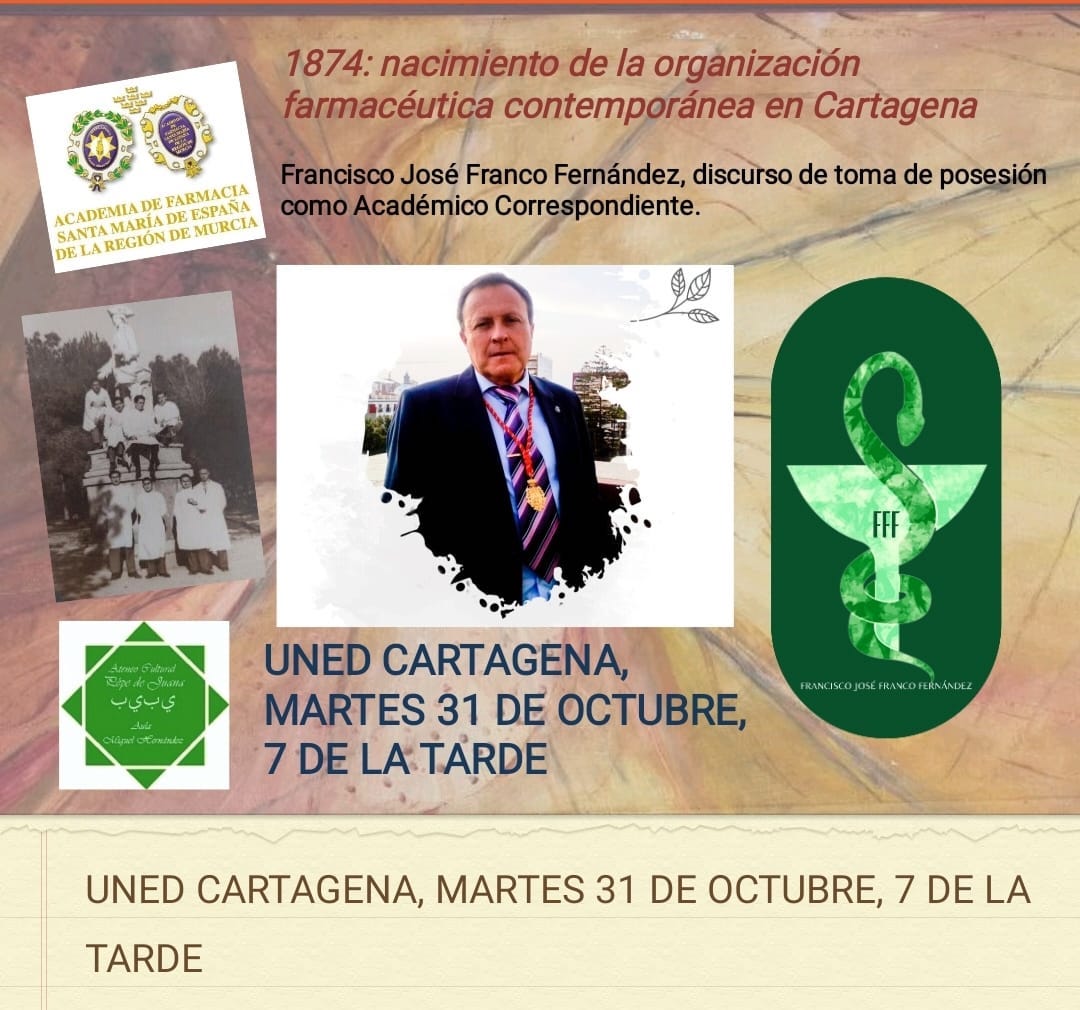 El escritor e historiador cartagenero, integrante del equipo de cronistas oficiales de Cartagena, ofrecerá el próximo martes, 31 de octubre, a las 19 horas en el salón de actos de la UNED, el discurso '1874: Nacimiento de la organización farmacéutica contemporánea en Cartagena' en su ingreso en la Academia de Farmacia 'Santa María de España'. Diez días más tarde ingresará José Luis Arias.