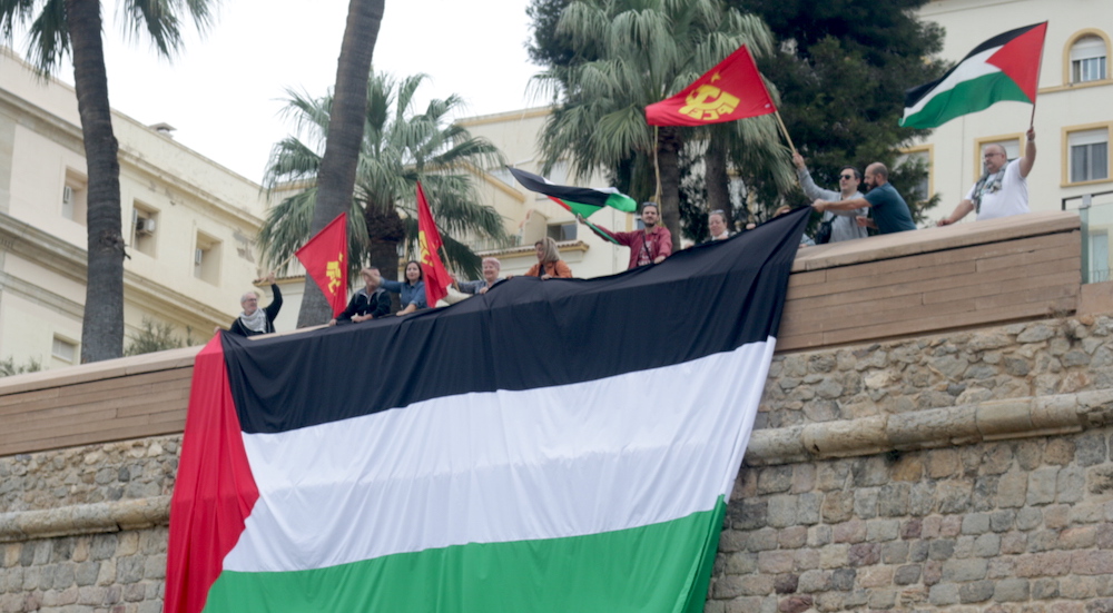 Esta mañana la Muralla del Mar de la ciudad portuaria de Cartagena ha amanecido con una bandera de dimensiones magntitudinarias sobre ella, acción de protesta cuya autoría ha sido reivindicada por los núcleos del Partido Comunista de España de la Comarca de Cartagena y Mar Menor, quienes han emitido un comunicado en defensa del pueblo palestino y su derecho a la "legítima resistencia frente a la política de ocupación y apartheid del régimen criminal y sionista de Israel."