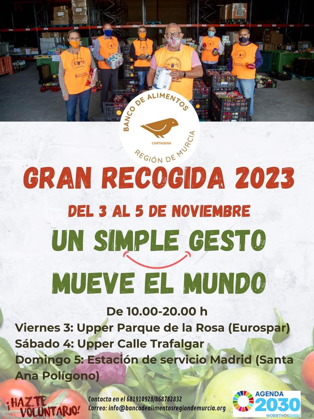 Banco de Alimentos de la Región de Murcia de Cartagena llevará a cabo del 3 al 5 de noviembre (viernes a domingo de esta semana) la recogida de 10 a 20 horas en cada jornada, siendo los lugares elegidos, respectivamente cada día, los supermercados Upper del parque de La Rosa y de la calle de Trafalgar, además de la estación de servicio de la entrada al Polígono Santa Ana.