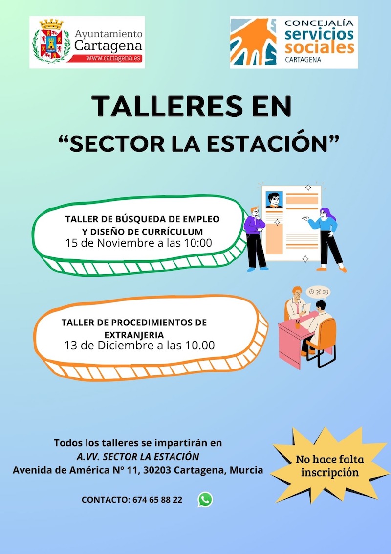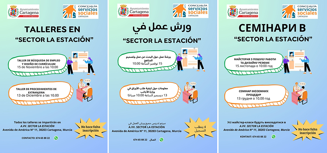 La asociación de vecinos, que preside Fulgencio Sánchez, convoca a los vecinos con carteles elaborados en los idiomas español, árabe y ucraniano al taller de búsqueda de empleo y diseño de currículo que tendrá lugar el 15 de noviembre y el de procedimiento de Extranjería, que se desarrollará el 13 de diciembre.